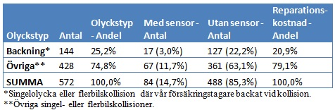 Se nedan för bilagd tabell över olycksfördelning och andelen bilar med backsensor.