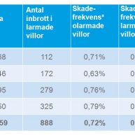 ”Skadefrekvens” definieras som antal anmälda inbrott dividerat med antalet försäkrade villor. ”Totalt” är ett viktat snitt för de fyra redovisade åren. Siffrorna omfattar villor försäkrade hos Folksam.