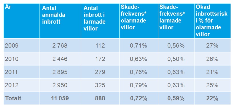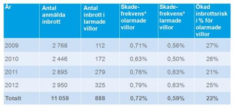 Under 2012 polisanmäldes 14 000 villainbrott i Sverige*. Nya siffror från Folksam visar att villalarm kan göra skillnad. Bor du i en villa utan larm är det 22 procents högre risk att råka ut för inbrott.