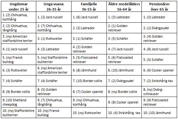 Folksams undersökning visar att små hundar är populärast bland ungdomar under 25 år. Den stora favoriten bland unga hundägare är chihuahua, oavsett om den har kort eller långt hår. Jack russell toppar listan för både unga vuxna, 26-35 år, och 36-55-åringar. Men medan chihuahua intar andraplatsen bland unga vuxna så är labrador klar tvåa bland 36-55-åringarna. Äldre medelålders, 56-64 år, samt pensionärer föredrar labrador, med golden retriever och dvärgpudel på varsin andraplats.