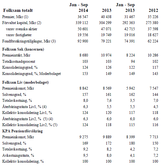 | Folksam totalt | Jan – Sep 2014 | 2013 | Jan – Sep 2013 | 2012 |