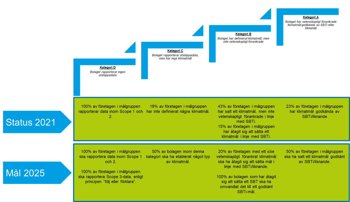 - Påverkan: Folksamgruppen har identifierat de 121 största utsläpparna av växthusgaser i koncernens placeringsportföljer. Fram till 2025 kommer Folksamgruppen via bolagsstämmor, direkta möten och andra påverkansaktiviteter, i eget namn eller i samarbeten med andra, arbeta för att bolagen på listan successivt förbättrar sin rapportering och målsättning kopplat till klimatomställningen. Bolag som redan täcks av Folksamgruppens befintliga påverkansinitiativ inom klimat har rensats bort från listan över de 121 största utsläpparna. De resterande 86 bolagen har sedan delats in i fyra olika kategorier beroende på vilken nivå deras klimatmål och -rapportering ligger på idag, med delmål kopplade till respektive kategori. Det övergripande målet är emellertid att minst 50 procent av dessa 86 bolag ska ha antagit vetenskapligt förankrade klimatmål senast 2025, godkända av Science Based Targets Initiative eller motsvarande. I dagsläget är den siffran 23 procent.